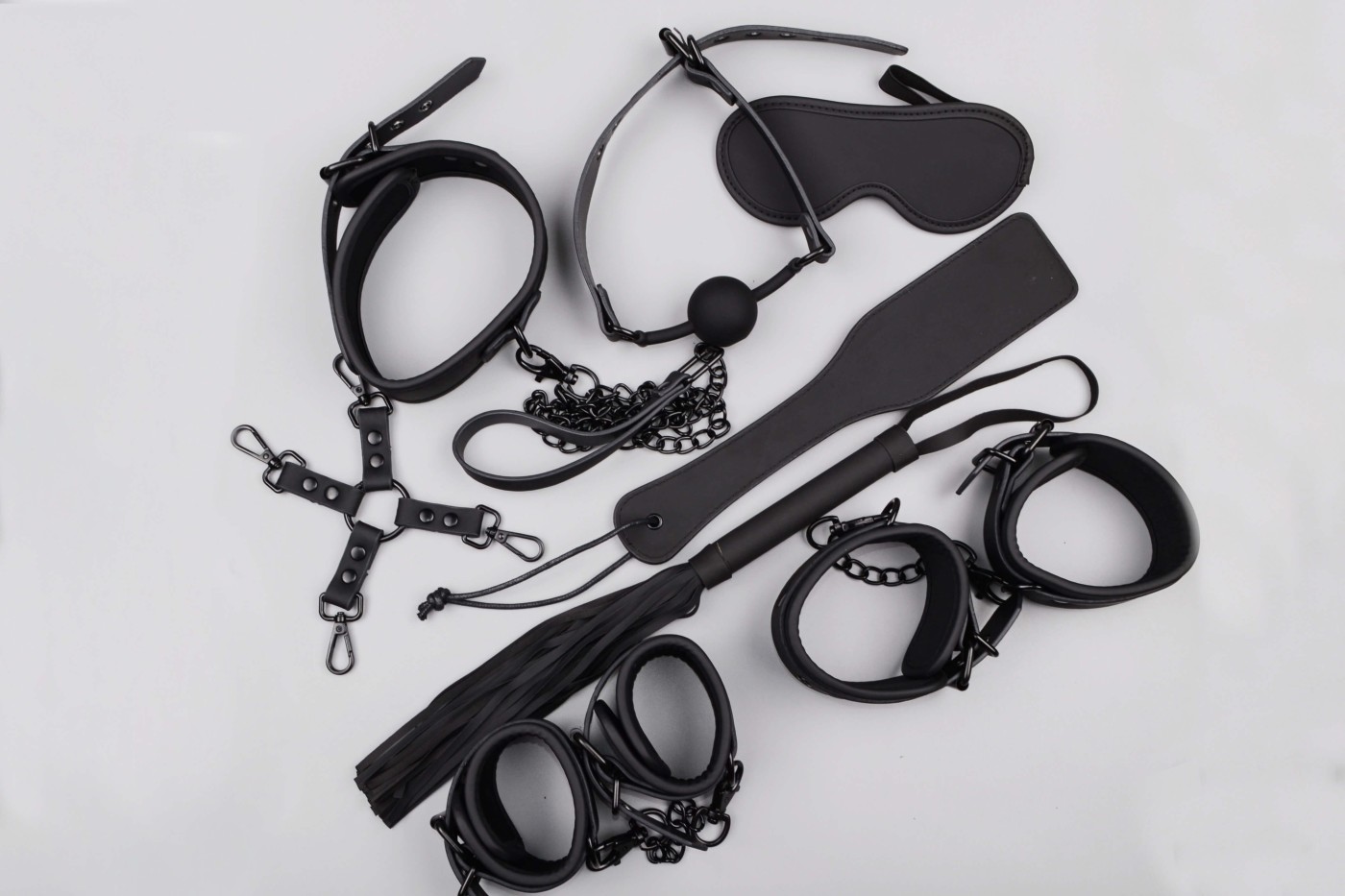 Všetky erotické pomôcky vrátane kufríka sú z kvalitnej koženky, ktorá je na dotyk hladká a príjemná. Guľôčka náustku sa vyrába z hypoalergénneho silikónu. Pútka a karabínky z odolného kovu podčiarkujú celkový design hračiek.