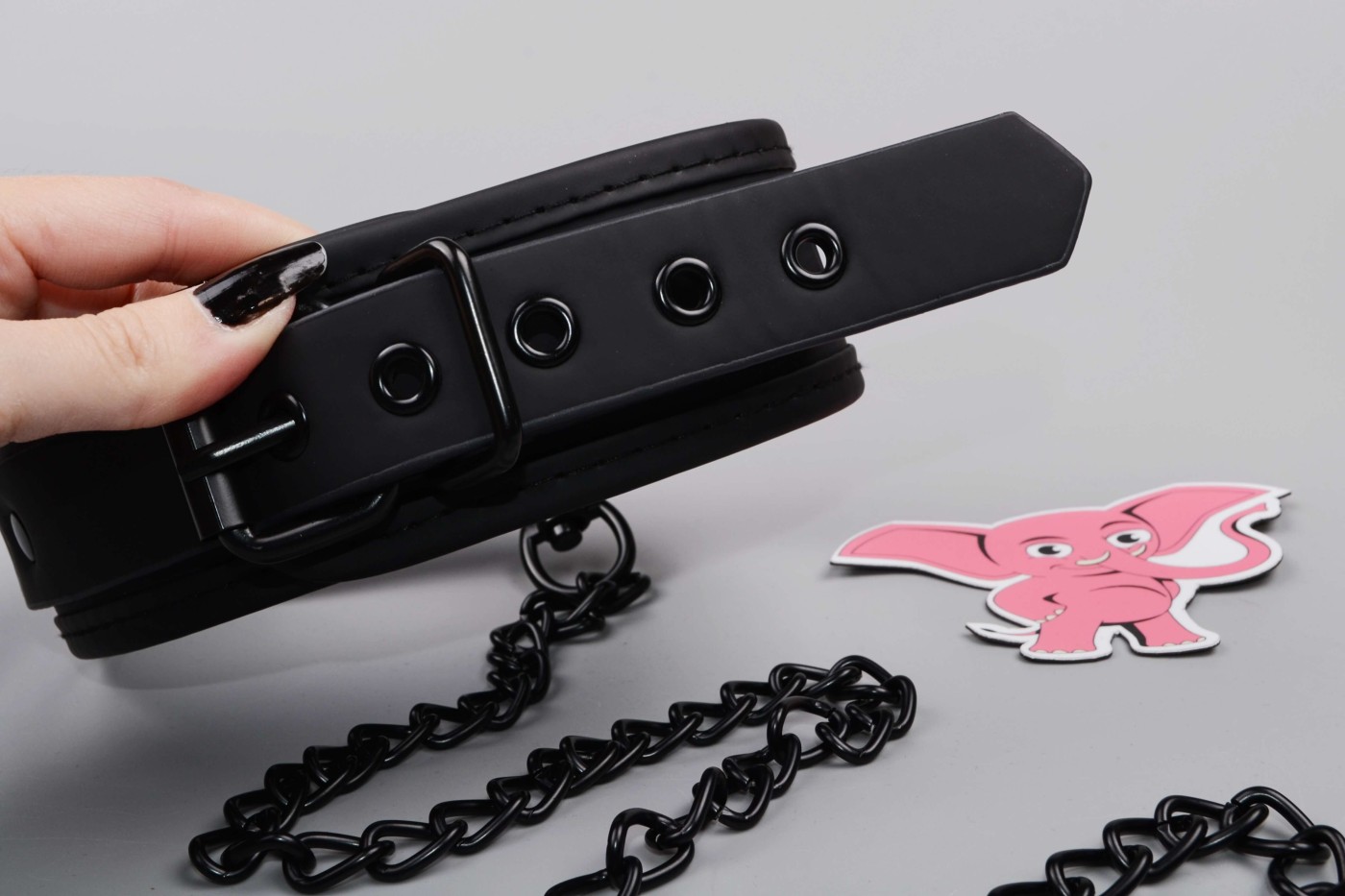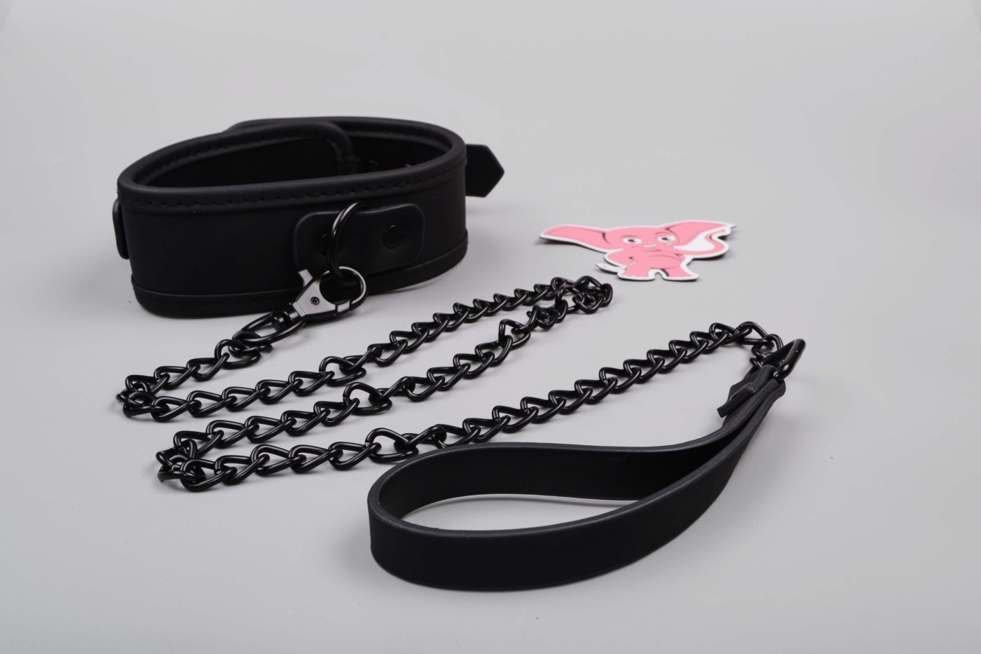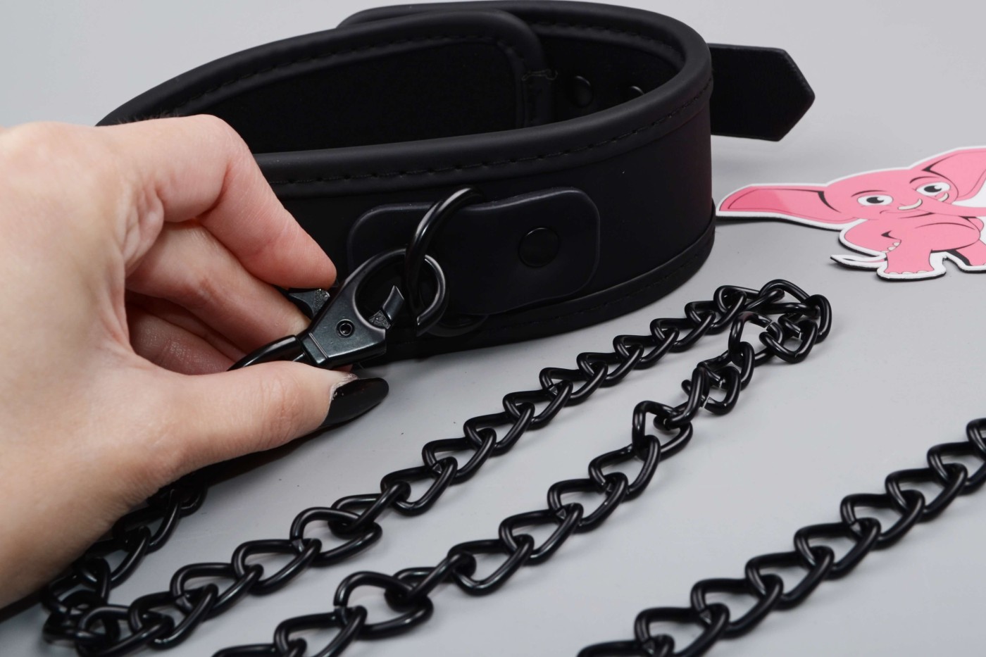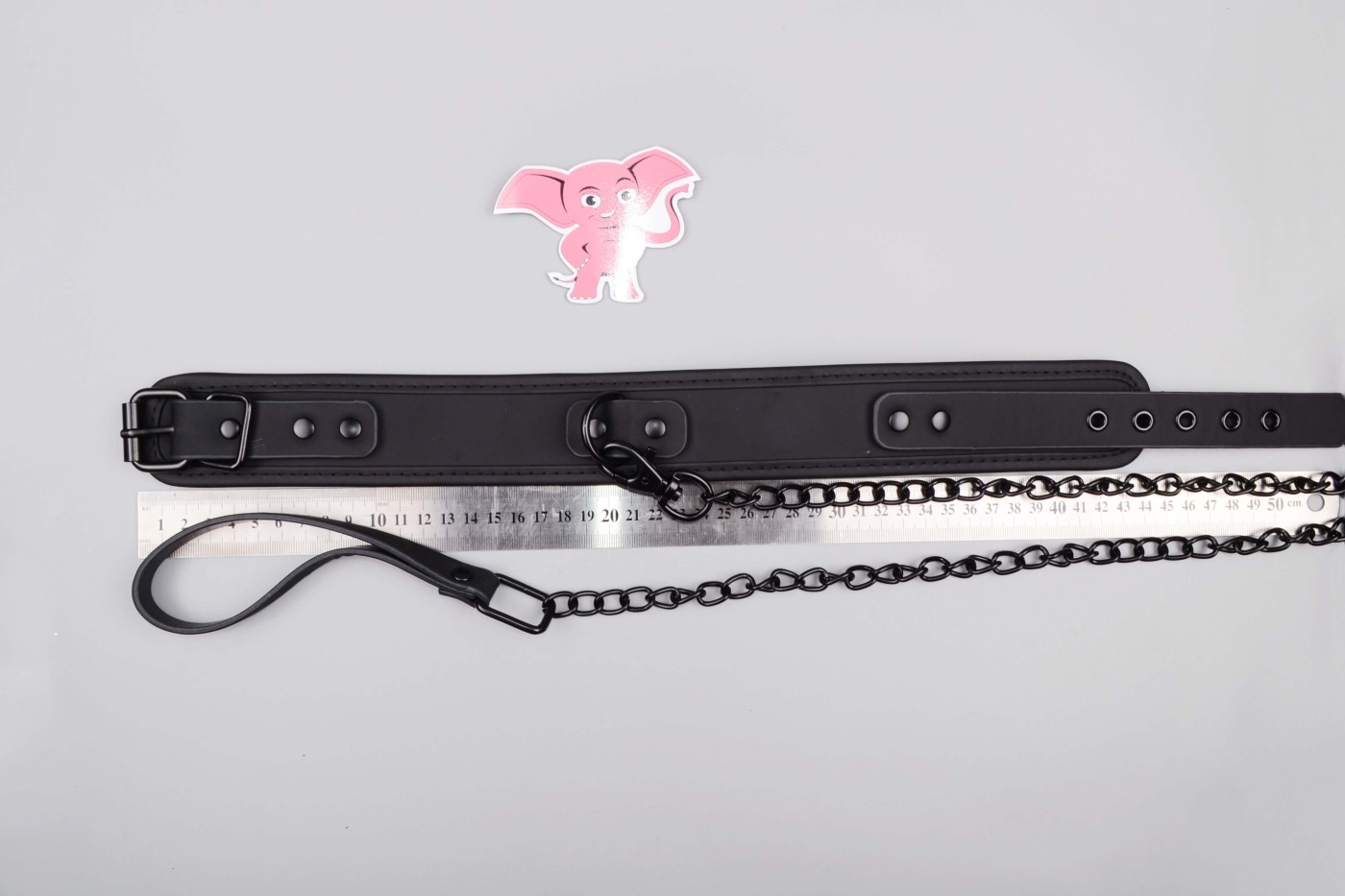 K širokému obojku, ktorý má 5 dierok, môžete pripojiť aj kovové vodidlo, ktoré oceníte pri pet play. Môžete si za neho i len pritiahnuť svoju submisívnu polovičku k sebe. Vodidlo sa za koženkové pútko dobre drží v ruke a celkovo vyzerá pevne.