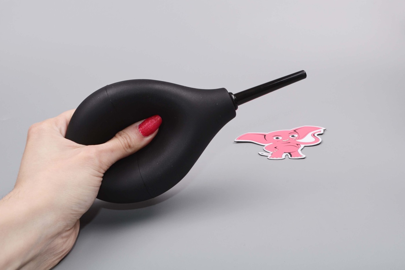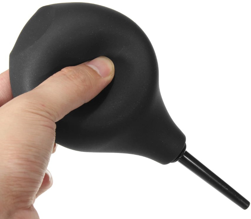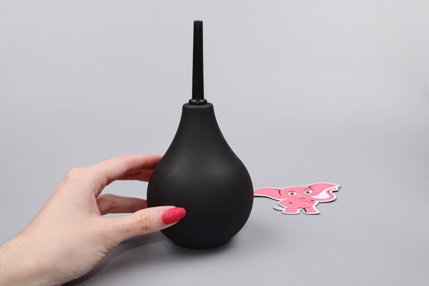 Balónik z silikonu aj po naplnení vodou jemne stlačíte prstami. Gumová manžeta bráni vytečeniu tekutiny mimo aplikátora. Rozprašovač z ABS plastu si jemne, ale spoľahlivo prekliesni cestu zadočkom.
