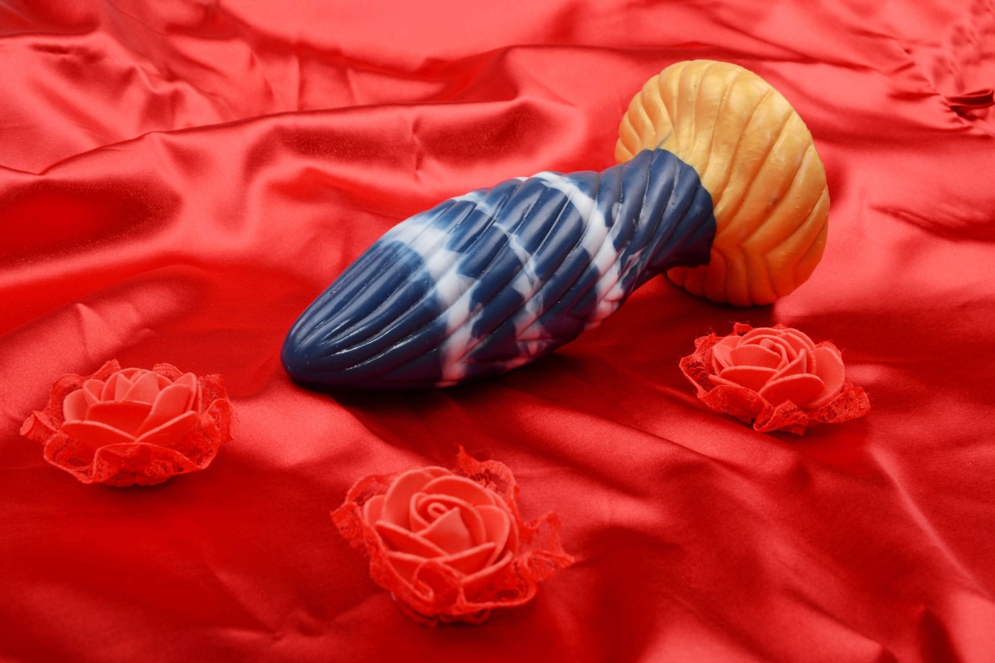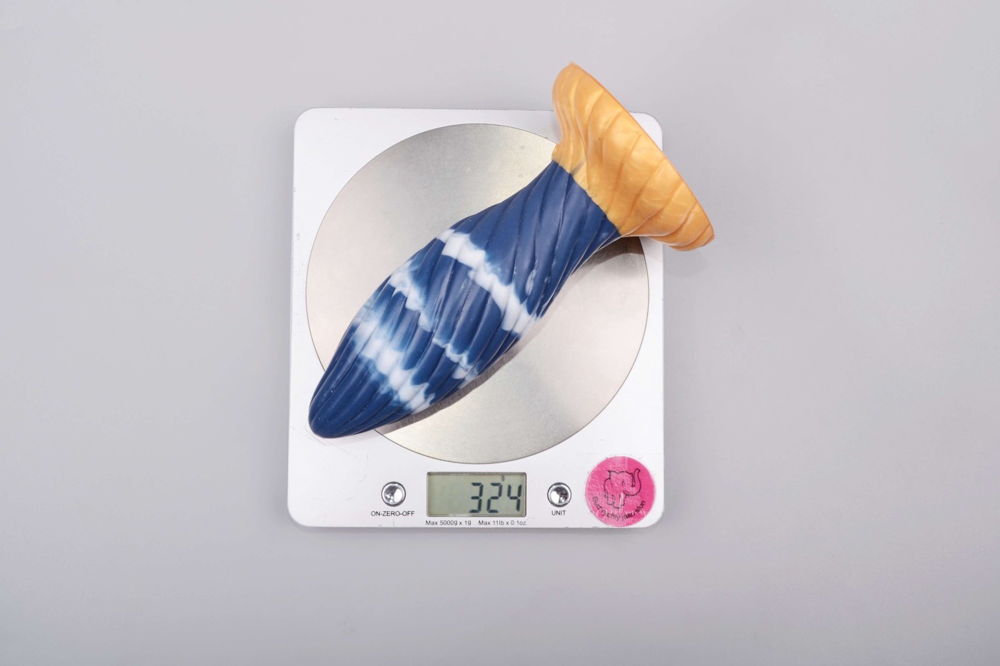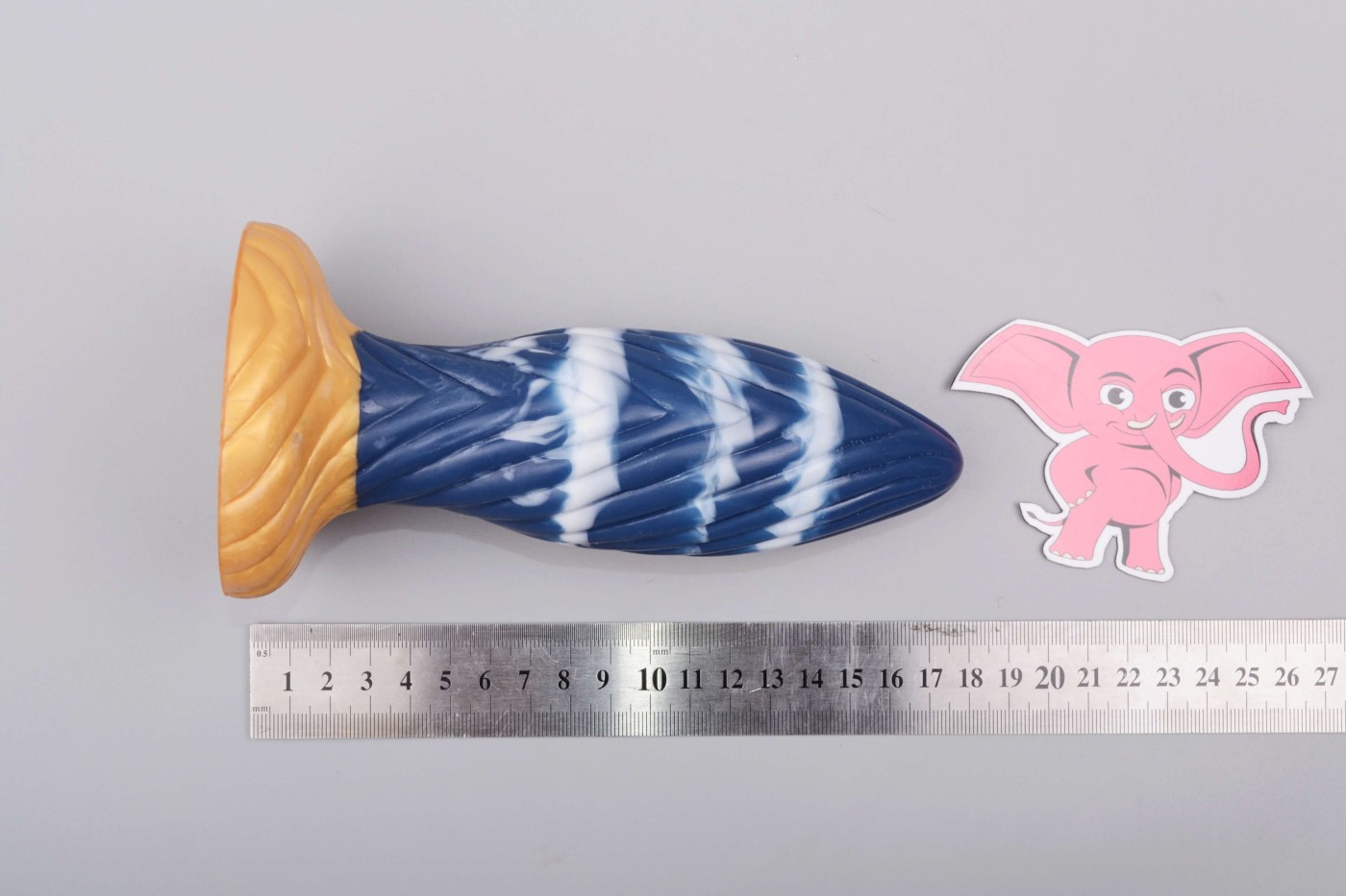 Modro-zlaté dildo s vertikálnymi drážkami vyzerá ako análny kolík. Vďaka svojej úzkej špičke a pomaly sa rozširujúcemu telu v tvare nábojnice sa ľahko zasúva do vagíny aj zadočku. Guľatá prísavka slúži ako zarážka a zároveň sa za ňou pomôcka dobre drží v ruke.