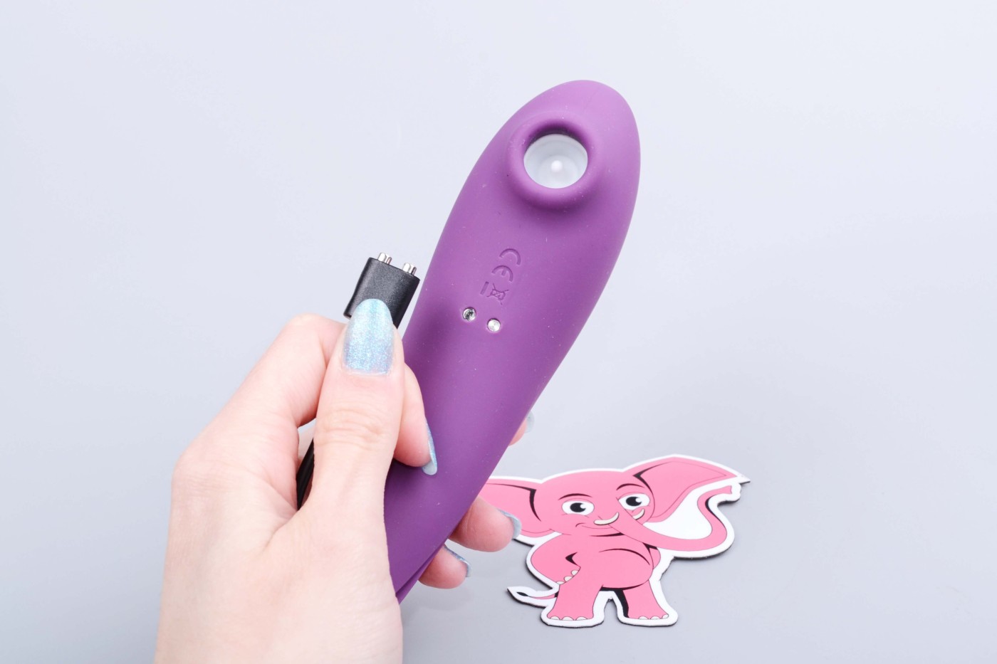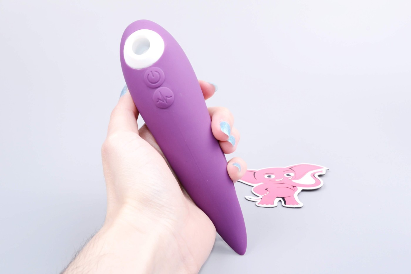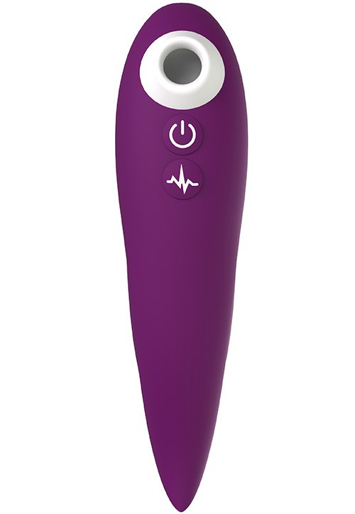Jednoduché ovládanie pomocou dvoch tlačidiel zvládnete aj potme. Dlhším stlačením hlavného ovládacieho tlačidla za sprievodu fialového podsvietenia zapnete aj vypnete tlakovú stimuláciu v oboch hubičkách na klitoris zároveň. Krátkymi stlačeniami prepínate intenzitu režimu.