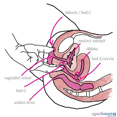 Začnite jedným prstom, neskôr pridajte druhý. Zasuňte prsty do pošvy pomaly, nežne. Prstami opisujte krivku jej tela. V hĺbke cca druhého kĺbu na prste nahmatáte G bod.